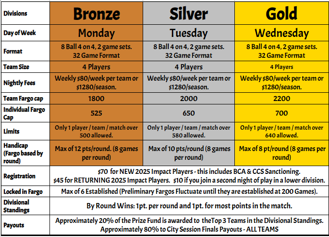 2000 Fargo Cap per team. No players over 610 FargoRating and only one per team/night allowed over 580.